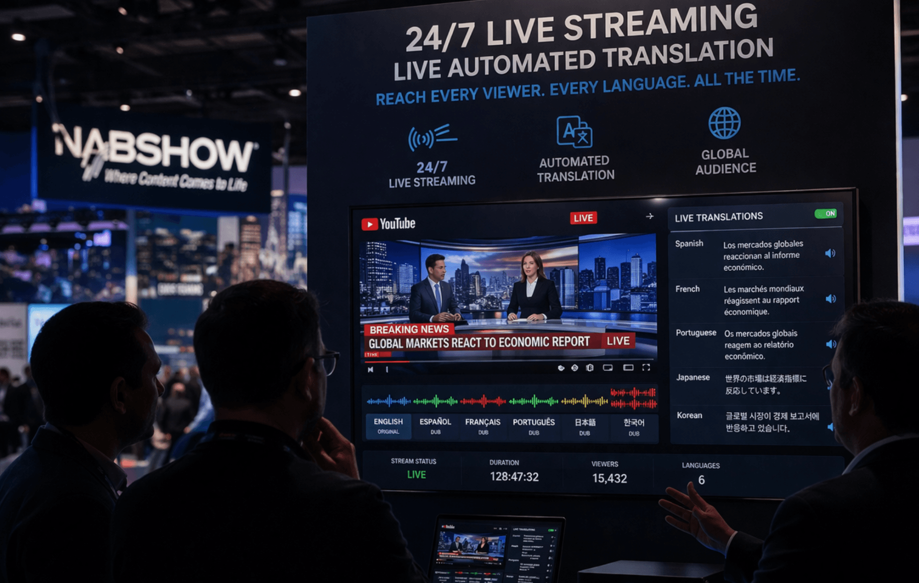 24/7 live streams that are not just broadcasting content, but continuously translating it in real time.